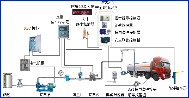 2、頂裝靜電溢油保護器帶聲光報警輸出,方便現(xiàn)場操作人員及時了解裝車狀態(tài);